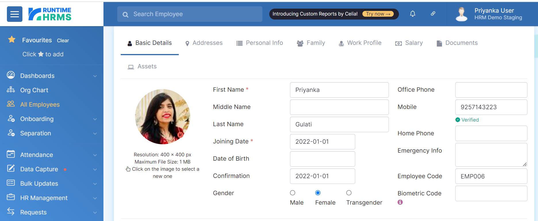 * Basic Details - In this section, you can save the employee's basic details including Name, Phone number, Joining Date etc.