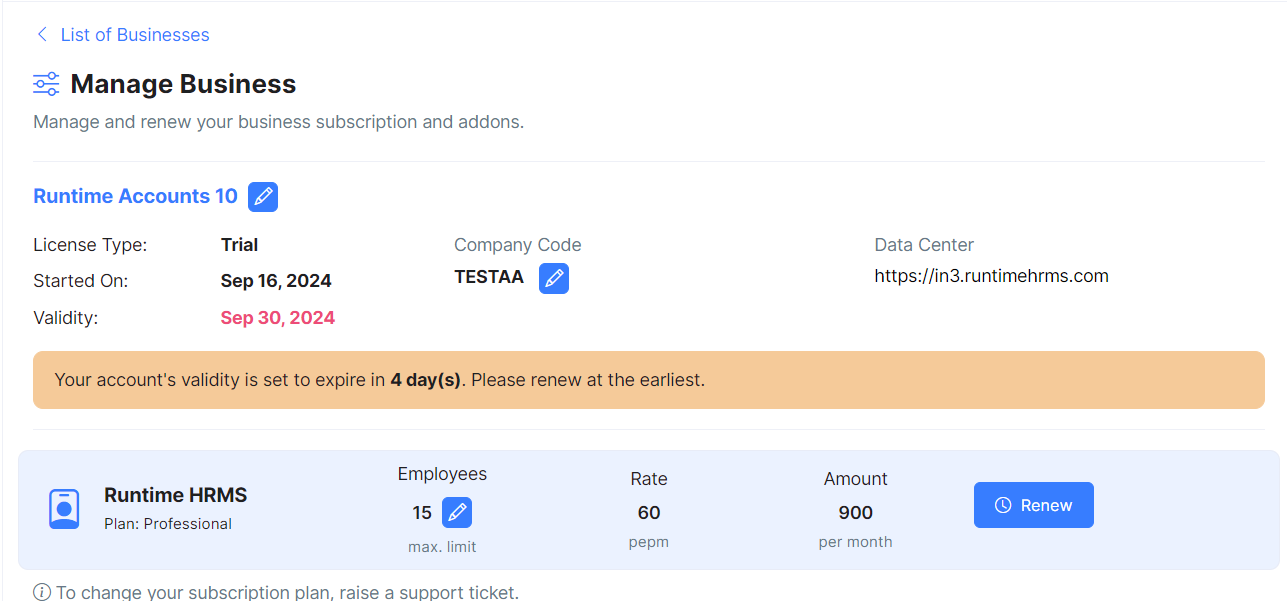 Managing subscriptions on Runtime Account portal are simple and easy to use. You have full control over your account and charges. In case you need additional help related to subscription management and payments, feel free to reach out to us at connect\[at]runtimehrms\[dot]com or raise a support ticket from the support menu (available on left navigation menu).