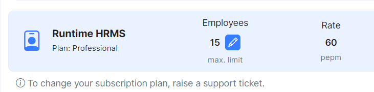 Runtime HRMS comes with a base subscription plan which is billed on per-employee basis. You can select the number of employees in your plan at the time of signup. This limit can be increased or decreased any time (details below).&#x20;