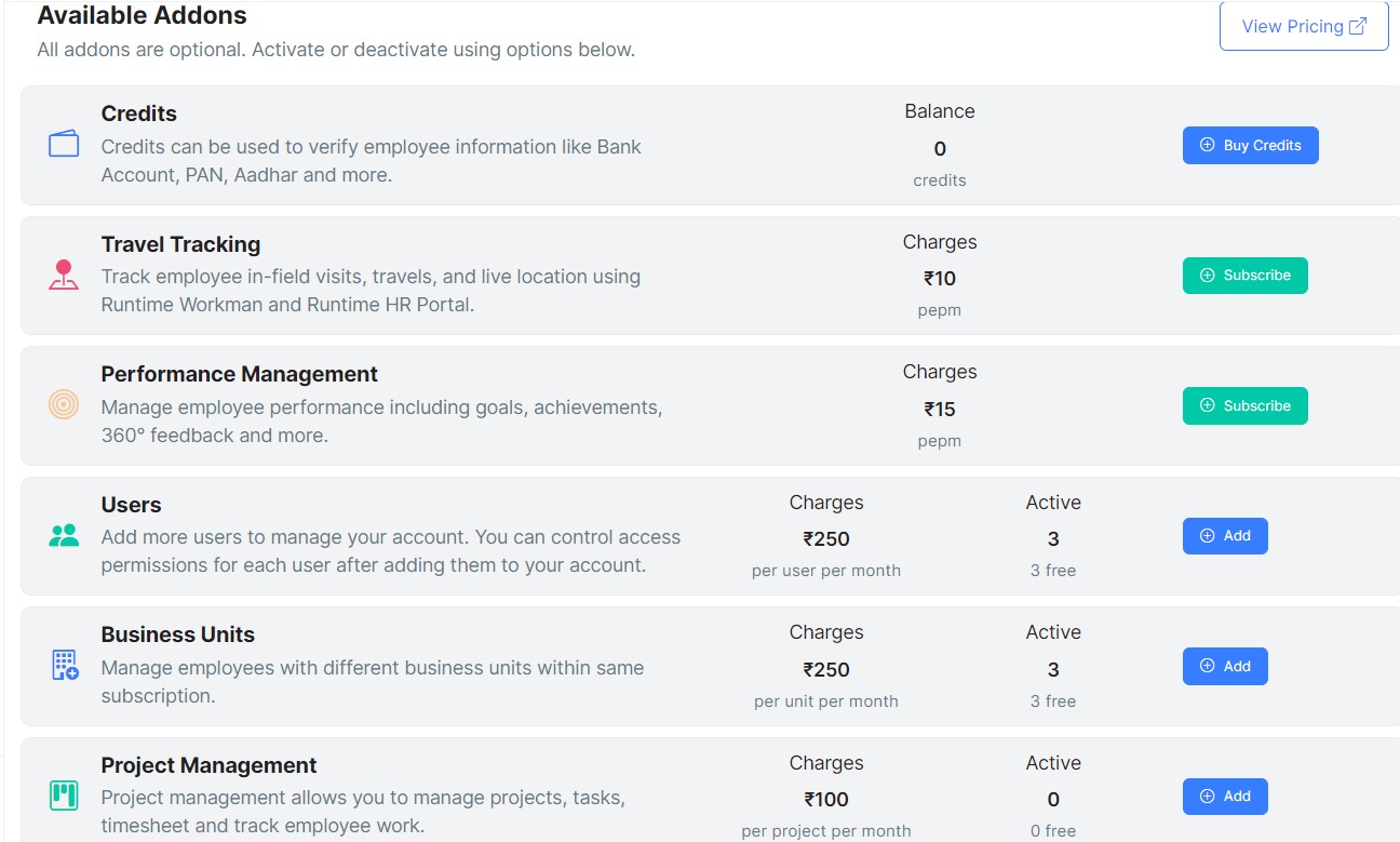 Runtime HRMS comes with many addons like Performance Management, Project Management, and more. An addon, as the name suggests, adds new functionalities to your subscription.